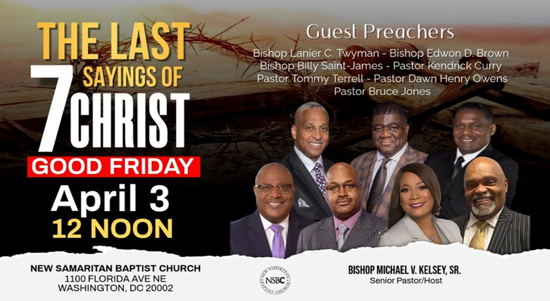 - Pastor Jones will be preaching at The Last 7 Sayings of Jesus Christ service at New Samaritan Baptist Church, located at 1100 Florida Avenue, NE, Washington, DC 20002. Service begins at 12noon.
